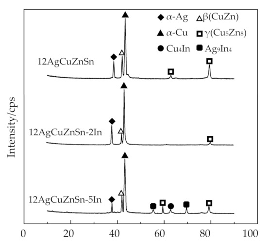 The phase constitution of 12Ag–Cu–Zn–Sn–xIn filler metals was clarified by X-ray diffraction analysis, and Figure 5 shows the XRD patterns. According to the PDF cards and X-ray diffraction analysis, 12Ag–Cu–Zn–Sn–xIn alloys are mainly composed of α–Ag (Ag-based solid solution), α–Cu (Cu-based solid solution), and CuZn compounds phase (mainly β–CuZn and γ–Cu5Zn8 phase), there into, the brittle electron compound γ–Cu5Zn8 deteriorates the mechanical properties of brazing filler metals. As we can see from Figure 5, the diffraction peaks of CuZn compounds phase decrease when the In content of the brazing alloys is 2 wt.%, which is beneficial to the mechanical properties of the substrate [17]. However, the new intermetallic compounds Cu4In and Ag9In4 arose when the In content reaches 5 wt.%.
