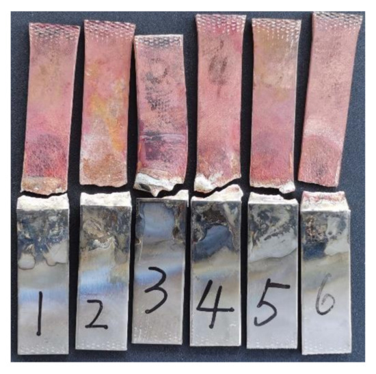 The quality of copper/steel brazing joints was evaluated by tensile test at room temperature. The remarkable thing is that the fracture positions of the specimens all occurred on the copper plate, as shown in Figure 9, which indicated that the seam strength was higher than that of copper substrate, and the copper/steel joints with excellent mechanical properties were obtained.