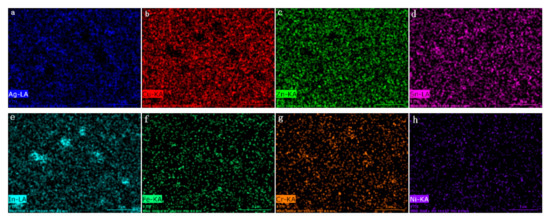 The elements mapping of the fracture morphologies of the brazing joint of 12Ag–Cu–Zn–Sn–3In filler metal in Figure 11: (a) Ag, (b) Cu, (c) Zn, (d) Sn, (e) In, (f) Fe, (g) Cr, (h) Ni.