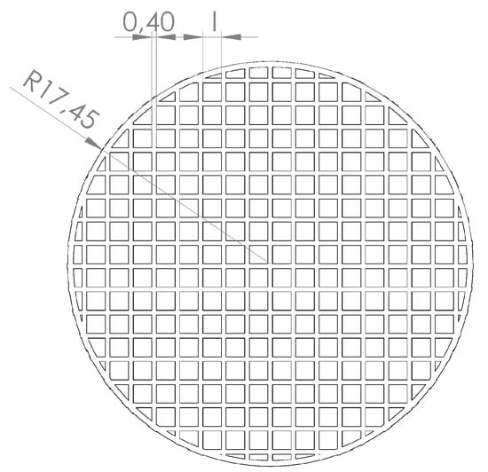 A biocompatibility test was carried out to assess the suitability of PLACTIVE™ (PLACTIVE AN1™, nano-additive concentration 1%, Copper3D, Santiago, Chile) for 3D printed prostheses. Table 1 shows the main material properties. 3D-printed PLACTIVE™-based grids were designed using a ray R = 17.45 mm, 0.4 mm in thickness, and square intertwining with three different sides (l): 6.6 mm (grid #1), 1.6 mm (grid #2), and 0.6 mm (grid #3), see Figure 1. The grids were printed with a Dreamer NX 3D printer (Flashforge Dreamer, Flashforge 3D Technology Co.Ltd, Jinhua, Zhejiang, China) [] using the printing parameters in Table 2. The day before each experiment, the grids were incubated for 1 hour in absolute ethanol and left drying under the laminar flux of a bio-safety cabinet. Immediately after, the grids were sterilized under UV rays, 20 min each side, and left in the cabinet until use. For the experiment, 30 × 103/mL Hek-293 cells [,] (Human Embrionic Cell-293line, ATCC, CRL-1573, Manassas, VA, USA) were plated onto 35 mm Petri dishes (Falcon dishes, polystyrene, ref. 353001, Corning, Corning, NY, USA) in a grown-medium containing D-MEM (Dulbecco’s Modified Eagle’s Medium), 10% fetal bovine serum, and 1% penicillin-streptomycin (all culture reagents were purchased from Gibco-Thermo Fisher Scientific, Waltham, MA, USA). One of the grids was added to one of the dishes; the Petri dishes that did not contain the grid were used as control. Cells were incubated at 37 °C and 5% CO2 for 48 h and then counted with a Bürker cell counting chamber (BRAND™ Bürker Counting Chamber, Fisher Scientific, Waltham, MA, USA).