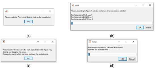The proposed methodology consists of generating a user-tailored orthosis based on the boundaries of cross sections extracted from a 3D-point cloud of a body part of interest. Since the CAD of the orthosis is based on boundaries (XYZ curves), the CAD software does not have to manage a 3D-point cloud. Therefore, the need to use highly specialized 3D-point cloud design software is eliminated. On the other hand, starting from very little information provided by the user, the boundaries of the cross sections are automatically obtained through a script programmed in Matlab (Matlab 2017b, MathWorks Inc., Natick, 226 MA, USA). Later, the boundaries can be loaded into the CAD software. A GUI runs the Matlab script and gives the user the instructions that have to be followed. Figure 2 shows the screenshots of the instructions given to the user once the generated Matlab executable is run. The proposed methodological steps (step 1–step 9) for the user-tailored orthosis design are presented as the following: