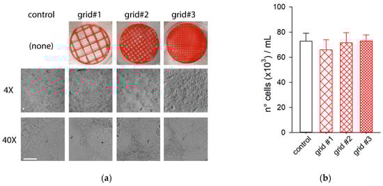 Cell culture outcomes: (a) Pictures illustrating the PLACTIVE™-based grids used for the experiments (up) and representative images obtained from Hek-293 cell cultures in the absence or presence of grid, at 4× and 40× magnification (center and bottom, respectively, horizontal bar 50 µM); (b) Bar graphs representing the average values of the number of cells/mL under the different experimental conditions.