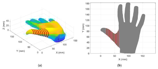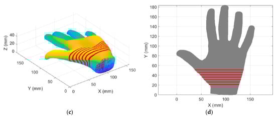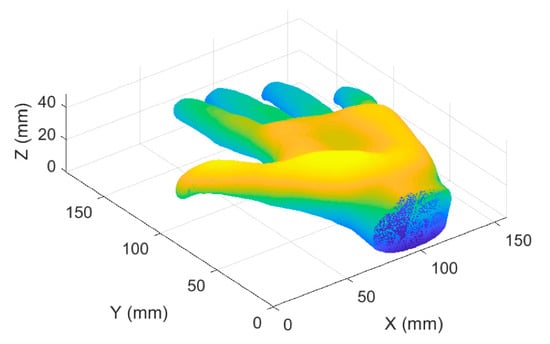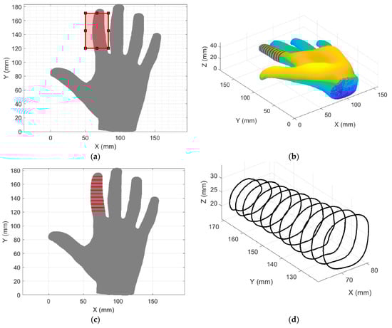 The proposed methodological steps in Section 2.2 have been applied to design a user-tailored forefinger orthosis. Each result presented bellow has been related to the methodological steps (step 1–step 9) previously presented in Section 2.2. In step 1, after the file was uploaded in Matlab (Matlab 2017b, MathWorks Inc., Natick, 226 MA, USA), the human hand was automatically shown as in Figure 4. The 3D plot as in Figure 4 can be moved to view the hand from any perspective. In step 2, plane2 (X, Z) was selected as a work plane as this was convenient for the cross-section extraction of the forefinger. In step 3, the plane (plane3), as in Figure 5a, was automatically showed perpendicular to the chosen work plane (plane2) showing the palm of the hand. Therefore, a zone of interest on the forefinger was pointed out within a rectangle as shown in Figure 5a. In step 4, the distance between each cross section was defined as 5 mm.