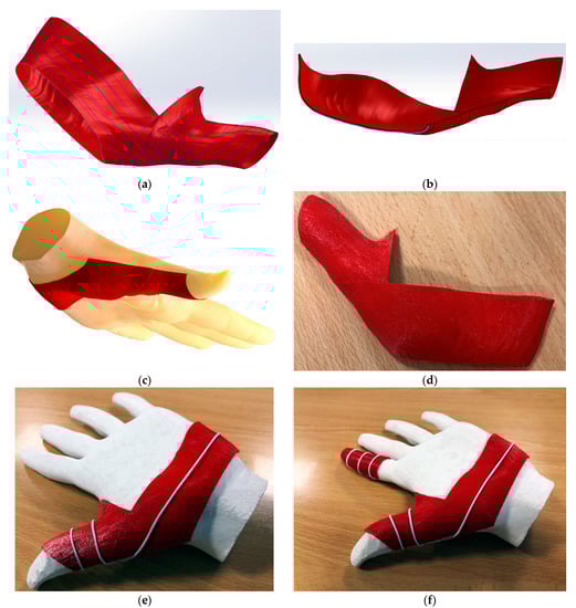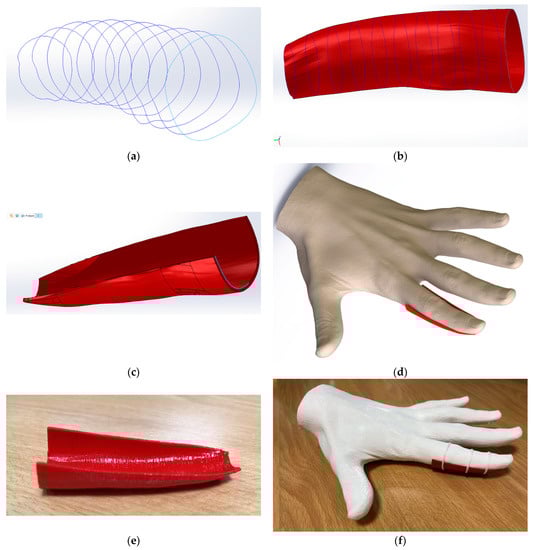 In step 7, the boundaries were uploaded to SolidWorks software (SolidWorks version 2018, Dassault Systèmes, S.A., Suresnes, France), see Figure 6a. In step 8, a surface was generated around the boundaries (see Figure 6b). In step 9, an upper cut was made so that the orthosis can be easily worn and a thickness of 1 mm was applied to obtain a solid body (Figure 6c). Figure 6d shows a CAD (computer-aided design) image of the generated orthosis dressing used on a human hand. Figure 6e shows the printed forefinger orthosis. To illustrate how the orthosis is dressed in practice, Figure 6f shows the printed forefinger orthosis dressing a 3D printed sample of a human hand. As seen in Figure 6f, the orthosis can be fixed to the hand using adjustable straps, rubbers bands, or medical adhesive tape.