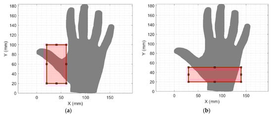 In addition to the design of the user-tailored forefinger orthosis, the proposed methodological steps in Section 2.2 were applied to design a user-tailored thumb orthosis. Each result presented below has been related to the methodological steps (step 1–step 9) previously presented in Section 2.2. In step 1, the human hand was automatically shown again as in Figure 4 in Section 3.2. Since the thumb orthosis is more complex to design, the design is composed of two areas of interest (Zone 1 and Zone 2). In step 2, plane1 (Y, Z) was selected as the work plane for Zone1 and plane2 (X, Z) for Zone2. In step 3, Zone 1 and Zone 2 were highlighted within a square as shown in Figure 7a,b, respectively. In step 4, the distance between cross sections was defined as 5 mm for each zone of interest. In step 5, the cross sections automatically extracted from Zone 1 and Zone 2 were shown as in Figure 8a,b and Figure 8c,d, respectively. In step 6, the boundaries from the cross sections for Zone 1 and Zone 2, that were automatically generated and stored in a txt file, were shown as in Figure 9a,b, respectively.