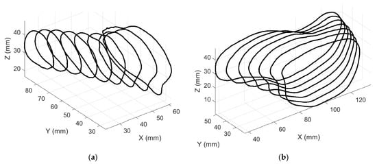 In step 5, the cross sections automatically extracted from the zone for interest are shown as in Figure 6a,b. As seen in Figure 5b,c, the cross sections were generated automatically for the selected zone of interest on the chosen work plane and with the desired separation (5 mm). In step 6, the boundaries from the cross sections, that were automatically generated and stored in a txt file, were shown as in Figure 5d.