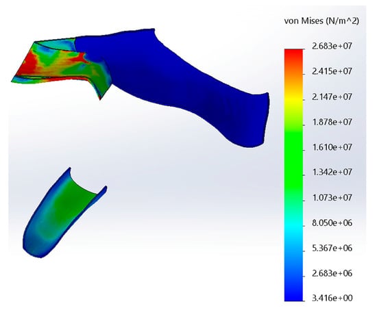 Before printing the obtained orthoses, a finite element method (FEM) analysis was quickly carried out to analyze the performance of the orthosis and their behavior in case the patient applies force. PLACTIVE material has been set as the material in the analysis using the mechanical characteristics previously shown in Table 1. The Von Mises stress criterion has been used to measure the stress components. The orthosis face housing the palm has been set as a fixed constraint. Two forces were taken into account as the forces that can be applied to a thumb and an index finger, namely 109.5 N and 60.4 N, respectively. The used finger forces were obtained by experiments in []. The forces have been set as normally distributed along all the area housing the mentioned fingers.