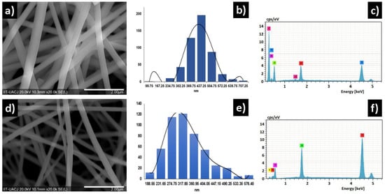 (a) SEM image, (b) Diameter size distribution and (c) EDX spectra of Fibers at 25 °C; (d) SEM image, (e) Diameter size distribution and (f) EDX spectra of Fibers treated at 800 °C.