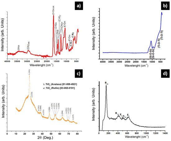 The polymer bands disappeared from the spectrum after heat treatment at 800 °C (Figure 2b), and only the bands belonging to the inorganic material of silica and titania were observed [3]. The infrared spectrum obtained from the SiO2–TiO2 ceramic fibers after heat treatment is shown in Figure 2b. The bands at 430 and 742 correspond to the stretching of the Ti–O bond, while those at 952 and 1080 cm−1 belong to the stretching of the Si–O–Si bond. The X-Ray Diffraction characterization of ceramic fibers revealed the presence of the crystalline phases of titania: distinctive peaks of anatase phase were observed at 2θ 25.4°, 38.1°, 48.2°, 53.9°, 55.1°, 62.7°, 70.3° and 75.1°, which are associated to the planes (101), (004), (200), (105), (211), (204), (220) and (215) [01-089-4921]; and the peaks of the rutile phase were located at 27.5°, 35.6°, 41.3°, 54.42°, 55.5°, 68.9° and 69.4°, associated with the planes (110), (101), (111), (211), (220), (301) and (322) [03-065-0191]. The planes in Figure 2c are wide and with low intensity, which implies low crystallinity, with increased presence of the anatase phase. The diffractogram also shows a wide band between 15 and 35°, over which the anatase characteristic peak stands out, indicating the presence of an amorphous silica material contained in the fibers. When analyzing the silica-titania fibers by X-ray Diffraction, the crystalline phases anatase and rutile of titania were found at 800 °C. It would be expected to find only the rutile phase, because when thermal treatment is increased to more than 550 °C, the anatase phase gradually becomes rutile. However, in this case, the presence of silica prevents the transformation of anatase, making it possible to find both phases [25,26]. Figure 2d shows the Raman spectrum of the TiO2–SiO2 fibers treated at 800 °C. Characteristic bands are identified for B1g vibrational modes at 409 and 526 cm−1 for the anatase crystalline phase. The bands located at 409 and 611 cm−1 correspond to the Eg and A1g movements of the rutile phase. The highest intensity band located at 151 cm−1 is attributed to vibrational modes Eg and B1g present in both crystalline phases [27]. The formation of stable tetragonal anatase below 700 °C, and rutile tetragonal structure close to 700 °C, is known. The presence of both crystalline structures at temperatures up to 1200 °C was attributed to an interference of silica in rutile formation in the hybrid silica-titania composites. Therefore, it is possible to attribute the presence of both crystalline structures in the fibers treated at 800 °C to the interference of silica during the sintering of the composite.