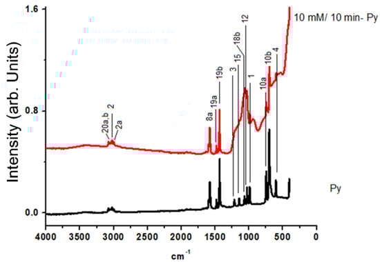 Infrared spectrum bands obtained from Py concentrated alone and Py on the support doped for 10 min in a concentration of 10 mM AgNO3 [3,30,31].