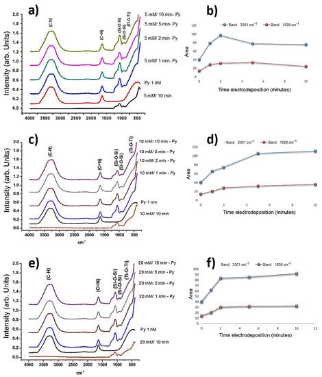 In order to verify that the amplification effect occurs in bands of pyridine (Py) and not in water in infrared spectroscopy, a solution of concentrated pyridine (99.7%) alone in diamond crystal using the ATR technique and pyridine on the support was analyzed; the observed spectrum is shown in Figure 6. Bands located at 3078, 3033, 3023, 1580, 1482, 1435, 1213, 1147, 1068, 1029, 988, 746, 701, 676, 603, and 403 cm−1 were observed, which belonged to different vibrational modes of pyridine, in addition to the bands located at 1080, 952, 742, and 430 cm−1 that belonged to the ceramic support. The vibrational modes of the observed bands are shown in Table 1 and those of pyridine are illustrated in Figure 6 [30,31]. The infrared bands generated by the 1 nM pyridine solution are shown in Table 2 and Figure 7a,c,e. The first wide band with the most intense point between 3200 and 3500 cm−1 was due to the stretching vibrations of the ring C–H bond. The intensity of the second band was low, and it was observed at 2100 cm−1, which is characteristic of a monosubstituted ring. The third band located at 1636 cm−1 was formed by the stretching vibration of the C=N bond, and the fourth band over 500 cm−1 was due to vibration within the plane by deformation of the ring. The spectra obtained from the pyridine on the supports show the bands of the Si–O and Ti–O bonds, as previously described, plus the bands located at 3200 and 1636 cm−1. The silver doped supports in a concentration of 5, 10, and 20 mM AgNO3 did not show any remarkable behavior, with all four supports yielding the same spectrum. However, in the supports doped at different times in the concentrations of 5, 10, and 20 mM, the spectra showed amplification of the bands for pyridine. The area of bands 3301 and 1636 cm−1 of the supports doped at 5 mM yielded the data shown in Figure 7b, where it may be observed that the highest amplification for the support at 5 mM was for 2 min of electrodeposition. The area of these two bands for 10 and 20 mM in Figure 7d,e shows that the highest amplification between each concentration occurred in the support deposited for 5 min. The highest amplification for the twelve types of supports was observed at 10 min in a concentration of 10 mM AgNO3.