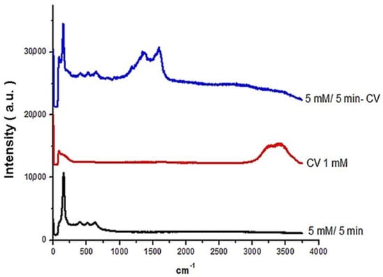Raman spectra of crystal violet (CV) on the support doped for 5 min at 10 mM of AgNO3.