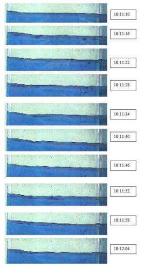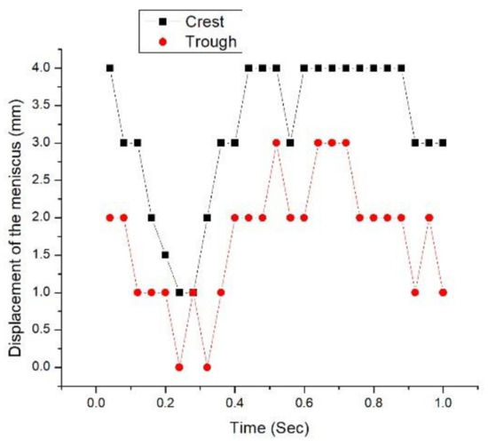 The maximum meniscus profile generated for each experiment was used to compute the maximum surface wave amplitude. From the recording, different photographs were taken out, and by using an image processor (MATLAB, R2012a, Mathworks, Natick, MA, USA), various images of meniscus fluctuation were obtained, as shown in Figure 6. It was observed that at a high flow rate of 60 L/min when compared to 40 L/min, there was a clear change in the maximum wave amplitude.