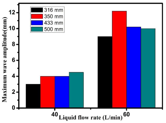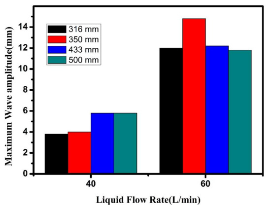 The maximum wave amplitude was found to be much higher at 60 L/min compared to a 40 L/min water flow rate. For all three nozzles (0°, 15° downward, and 15° upward), 15° downward and 15° upward nozzles were found to give a higher maximum wave amplitude compared to the 0° port at all the flow rates studied.