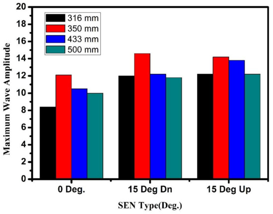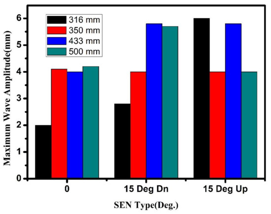 Figure 10 and Figure 11 compare the performance of three different SENS, 0°, 15° downward, and 15° upward, at four different section sizes and operating conditions with respect to the maximum surface wave amplitude. It can be observed from the Figure 10 and Figure 11 that the maximum surface wave amplitude increased with the change of SEN from 0° to 15° downward with most of the section sizes. However, the maximum surface wave amplitude decreased with some of section size (350 mm) as the nozzle was changed from 0° to 15° downward nozzle.