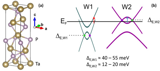 TaP belongs to the currently most studied family of WSMs, which also includes NbP, TaAs, and NbAs. These materials are nonmagnetic non-centrosymmetric WSMs with 24 Weyl nodes of two different types, usually dubbed as W1 (8 nodes) and W2 (16 nodes) [5,9,10,11,12,13]. The available band-structure calculations predict that in TaP the W1 nodes are situated some 40 to 55 meV below the Fermi level , while the W2 nodes are at 12 to 20 meV above it [11,12,13], see Figure 1.