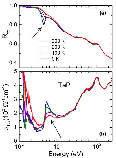 (a) Experimental in-plane reflectivity and (b) the corresponding real part of the optical conductivity of TaP at selected temperatures [35]. The arrows mark the feature discussed in this paper. The increased at low energies is due to intraband (Drude-like) absorption.