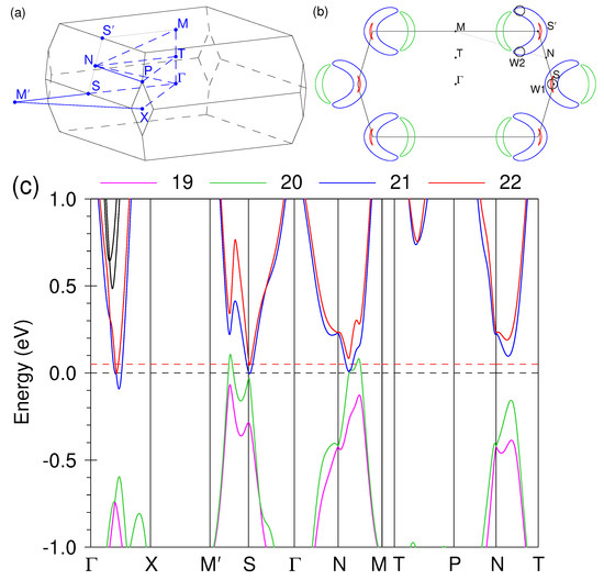 In Figure 3 we show the results of our band-structure calculations as well as the BZ of TaP. Four non-spin-degenerate bands, numbered 19 to 22, can be resolved in the vicinity of (at every given k point, the bands are numbered with increasing energy staring from the lowest calculated band). Note that the bands in each of the two pairs, (19, 20) and (21, 22), are split by SOC because of the lack of inversion symmetry. Our results reproduce well the published band structures of TaP calculated using the full-potential codes [11,13].