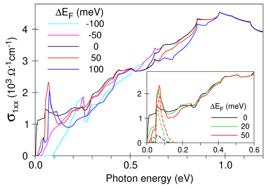 Figure 4 presents the results of our interband-conductivity calculations starting from the self-consistent band structure shown in Figure 3. The black solid line in Figure 4 shows obtained with as-calculated . The overall run of the experimental interband conductivity is well reproduced by this curve: increases with frequency and reaches a maximum at 1 eV (cf. Figure 2 and note that the intraband (Drude) contribution has not been taken into account in the band-structure computations). Nevertheless, no peak is visible in these computations at around 50 meV. A slight variation of provides such a peak, but only if the Fermi level is shifted upwards (red and blue curves). Shifting downwards does not change the spectra in the desirable way (magenta and cyan curves). The hight of the 50-meV peak reaches the experimental value of cm−1 at meV.
