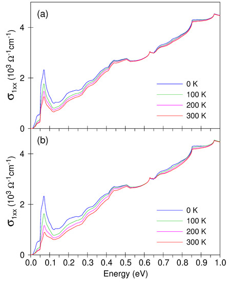 where is the energy derivative of the Fermi-Dirac function and is calculated with E being the energy which discriminates between the initial and final bands, so that at . The results of these computations are shown in Figure 5b. We note that we compute the temperature dependence of the interband contribution only. In order to reproduce the upturn of the measured conductivity at low photon energies, one needs to consider the temperature dependence of the intraband Drude term, which is beyond the scope of this work.