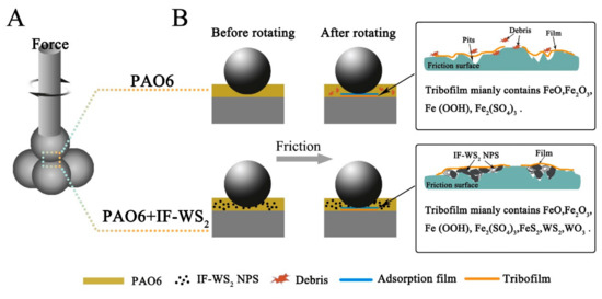 A schematic of the lubrication mechanism is proposed, as shown in Figure 1B. Chemical reaction occurred on the contact surface during friction, and tribo-films formed. For the pristine PAO6 oil, iron filings are oxidized to form boundary protective films of Fe2O3, Fe3O4, Fe(OOH) and Fe2(SO4)3. In the case of using IF–WS2 additives, the formed boundary protective films consist of FeS2, WS2 and WO3, apart from Fe2O3, Fe3O4, Fe(OOH) and Fe2(SO4)3. The protective films were very complex and advanced, were attached to the friction surface of the steel balls, which prevented its direct contact between the wear couple. The IF–WS2 additives could make up for the micro-pits and damages caused by the uneven distribution of iron-related oxides and therefore reduced friction and exhibited improved anti-wear performance.