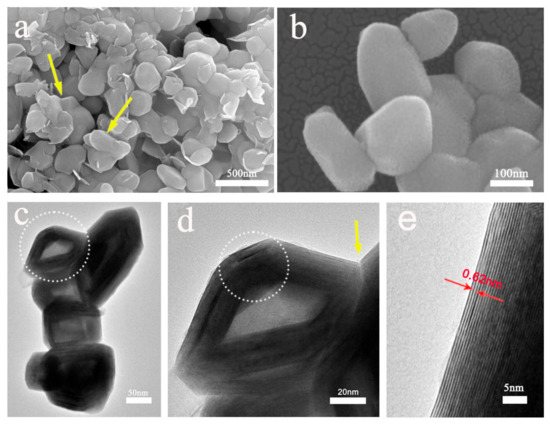 As shown in Figure 2a,b, the IF–WS2 particles formed in irregular polygonal shapes with an average size of around 100–200 nm. The surface agglomeration of IF–WS2 spheroids is also observed and probably caused by the fusion of adjacent WO3 during the heating process. The TEM image (Figure 2c–e) show that IF–WS2 presented the typical hollow core structures consisting of a large number of layers. The thickness of each layer is 0.62 nm, which matches well with the standard d-space value of the (002) plane of WS2. Our morphologies results agree well with Tenne et al. works [33]. Moreover, the TEM results also suggest that the agglomeration of these nanoparticles occurred before the conversion of oxide to sulfide [32].