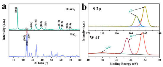 (a) The X-ray Diffraction (XRD) patterns of IF–WS2 NPs; (b) X-ray photoelectron spectroscopy (XPS) spectra of S 2p, W 4f.
