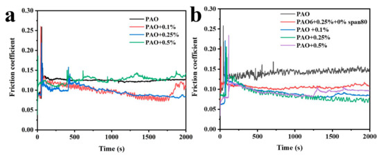 The coefficient of friction (COF) curve, the average coefficient of friction (AF) and the average wear scar diameter (AWSD) of the tested steel ball is presented in Figure 4 and Figure 5. The friction coefficient curve presents a high friction noise at the beginning of the test (time area between 0–250 s) due to the friction has entered the running-in stage. Thus, the iron scraps generated during the friction process are mixed into the PAO6 oil resulting in abrasive wear and increasing the coefficient of friction. The friction coefficient tends to be more stable at the end of the running-in stage due to the formation of a physical or chemical protective film on the surface (Table 1) [37,38]. After the running-in stage, the curve of IF–WS2/PAO6 lubricant tends to decrease gradually over time. It is suggested that a little IF–WS2 particles gathered on the surface of the friction pair during the friction test. Under high pressure, the outer shell of the IF–WS2 with cage structure could be peeled off during the period of the running-in stage, which changed the wear couple from point contact to surface contact to lubricate and reduce the coefficient of friction, just as the research of Maharaj and Joly-Pottuz et al. [39,40,41,42]. In addition, we noticed that the friction coefficient curve of the oil sample without span 80 dispersant is higher in Figure 4b. It may be due to the poor dispersion of IF–WS2 in PAO6 oil, and the larger aggregates are not easy to enter the contact area, which leads to the larger friction coefficient and poor lubrication performance.