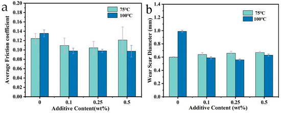 (a) average coefficient of friction (AF) and (b) average wear scar diameter (AWSD) diagram of different IF–WS2 contents at 75 °C and 100 °C.