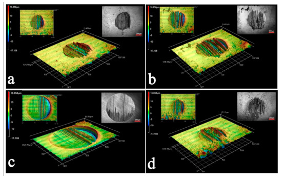 At 100 ℃, the scratches and furrows on the wear scar surface become 0.25 wt% IF–WS2/PAO6 less, and the furrow width becomes narrower, and the depth becomes shallower, as shown in Figure 6d and Figure 7b. The reason may be that the viscosity of PAO6 decreases with the increase of temperature, the obstruction of iron scrap removal became smaller and protected the friction surface. The wear area is also reduced by 50.57%, compared with PAO6.