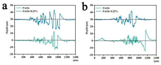 The effect of WS2 on the wear performance of POA6 was analyzed and with 3D topography (Figure 6) and wear profile (Figure 7). At 75 °C, there are many wear scratches on the worn surfaces of oil POA6 (Figure 6a) and 0.25 wt% IF–WS2/PAO6 (Figure 6b). Additionally, the scratches of 0.25 wt% IF–WS2/PAO6 are deep and even dense, deep furrows appear, and the right side of the worn surface is more obvious, as shown in Figure 7a. Its surface roughness is larger, and the wear is more serious. Compared with PAO6, wear surface area increases from 10,581.03 μm2 to 24,402.96 μm2 (Table 2). The furrows of 0.25 wt% IF–WS2/PAO6 contain more wear debris, which may be caused by viscosity at low temperatures. It prevents the wear debris and IF–WS2 in scratches from flowing out with lubricating oil in time and accumulating into large particles, which causes abrasive wear and ploughed the worn surfaces leads to more furrows.