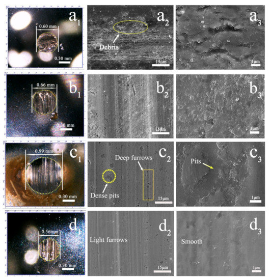 To further analyze the lubrication process of the IF–WS2 additive, the surface morphology of wear scars that occurred with different additive concentrations were observed, as shown in Figure 8. The SEM images show that the wear scar of the pristine PAO6 oil looked very rough, there are large areas of damage and debris (Figure 8a2,a3), and the worn surface exhibit many large pits and deep furrows at 100 °C (Figure 8c2,c3). Compared with the 75 °C samples, the damage at 100 °C is more serious, and the overall anti-wear performance is poor. In contrast, the wear scar for samples of PAO6/IF–WS2 became smoother. The roughness and debris of the wear scar surface are significantly reduced, although the width of the wear scar is not reduced at 75 °C. This may be attributed to the agglomeration and the chemical-curing phenomenon of nanoparticles with a high concentration. Therefore, it is hard for WS2 to form a continuous and uniform anti-friction layer on the friction region [47]. The defects become shallower, which made the wear slightly reduced, as shown in Figure 8b2,b3. The wear scar width and the plough grooves became much smaller at 100 °C. The pits basically disappear without obvious defects, the friction surface became very smooth, which indicates a better wear resistance (Figure 8d2,d3).