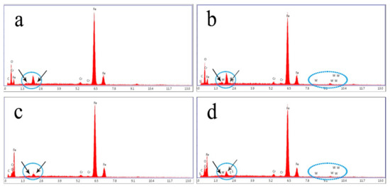 EDS profiles of the surface after friction process samples, under (a) pristine PAO6 oil and (b) PAO6 containing 0.25 wt% IF–WS2 at 100 °C; and (c) pristine PAO6 oil and (d) PAO6 containing 0.25 wt% IF–WS2 particles at 75 °C.