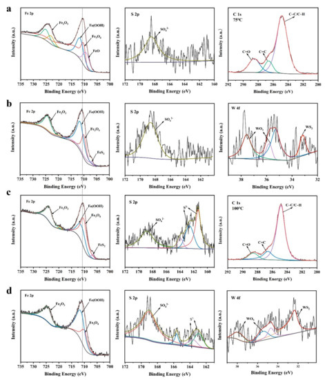 XPS spectra of the elements (C 1s, Fe 2p, S 2p and W 4f) on the worn surfaces, lubricated by pristine PAO6 at (a) 75 °C, (b) 75 °C and (c) 100 °C, and by PAO6 containing 0.25 wt% WS2 at (d) 100 °C.