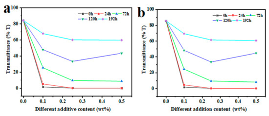 Graph of the relationship between different addition contents and transmittance with wavelengths of (a) 400 nm and (b) 630 nm.