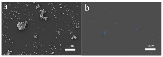 In order to analyze the reason why IF–WS2 particles disperse well in PAO6 oil, the dispersion effect of IF–WS2 particles was observed by scanning electron microscope. Figure 12a is an SEM image of 0.25% PAO6/IF–WS2 without active agent span 80. The figure shows that IF–WS2 particles have an obvious agglomeration phenomenon. Figure 12b is an SEM image of 0.25% PAO6/IF–WS2 containing active agent span 80. The figure shows that IF–WS2 with span 80 dispersant has good dispersivity and no obvious agglomeration. The reason is that the long-chain alkane at one end of the active agent span 80 has good compatibility with the base oil PAO6, which increases the wettability of IF–WS2 in PAO6 and reduces its surface energy. The other end is adsorbed on the surface of IF–WS2 particles to form a solvated film, as shown by the arrow in Figure 12b. At the same time, the polymer adsorbed by particles will produce new repulsive energy, increase the space distance, weaken the attraction between molecules, and effectively prevent the mutual contact between particles, thus maintaining a stable state and reducing agglomeration [51,52]. Span 80 can effectively improve the dispersion of IF–WS2, thereby improving the performance of IF–WS2 in POA6 lubrication performance.