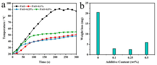 The actual working condition of the PAO6 oil with IF–WS2 particles is evaluated by a 280 W pointer standard lubricating oil anti-wear testing machine. The change of oil temperature during the friction test is shown in Figure 13a. In the working process, the oil temperature of pristine PAO6 oil reaches 89.9 °C at 200 s and then tends to stabilize. The temperature of those containing 0.1, 0.25 and 0.5 wt% IF–WS2 reached 50.5, 48.5 and 54 °C, respectively, at 300 s, which have a slower rate of oil temperature rise and a lower platform trend. These results showed that the additives effectively delay the rise of oil temperature, of which the 0.25 wt% content is the most effective. IF–WS2 has good heat transfer properties in oil, similar to layered graphite [53,54] and carbon nanotubes [55]. IF–WS2/PAO6 can obviously reduce the wear caused by weight loss (the difference between the mass before and after friction), as shown in Figure 13b. Additionally, the weight loss reduced by 87.8% for the 0.25 wt% sample. It may be that the oil temperature rises at different rates, which impels different temperatures and wear levels at the same stage.