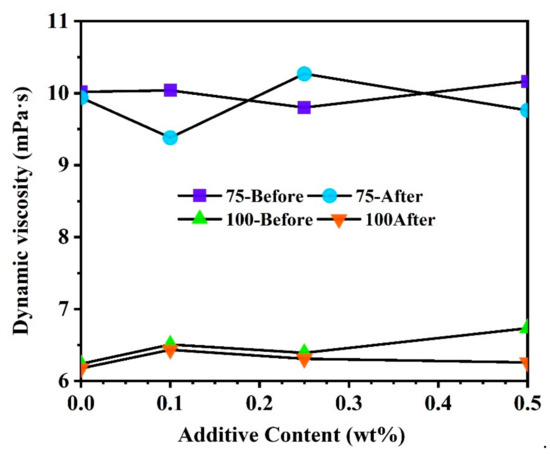 In order to better understand the influence of additives on the physical properties of the PAO6 oil, the dynamic viscosity of lubricating oil before and after the wear experiments was measured, and the results are shown in Figure 14. Before the wear test, with the change of temperature, the dynamic viscosity difference of IF–WS2/PAO6 with different contents is different, as shown in Table 3. With the increase of additive contents, the difference of dynamic viscosity change is smaller, which illustrates IF–WS2 the improved viscosity–temperature performance of PAO6. Meanwhile, the dynamic viscosity at 75 ℃ and 100 ℃ fluctuated around the average values of 10.01 mPa·s and 6.47 mPa·s, respectively. It should be noted that, due to the existence of dispersant span 80, the measured value of dynamic viscosity is larger than the standard value. After the friction test, the dynamic viscosity of lubricating oil with different additives has slightly fluctuated at 75 °C, the influence of IF–WS2 on viscosity was less than 6.6%. Conversely, the influence of IF–WS2 on viscosity is less than 2.5% at 100 °C.