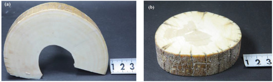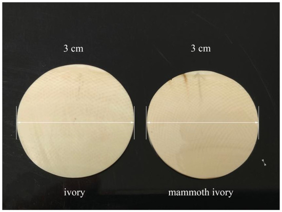 Representative specimen photographs of samples: (a) a sample of ivory from adult Zimbabwean elephants, light yellowish white, (b) a sample of mammoth ivory from mammoth in Russia (Siberia), deep yellowish white.