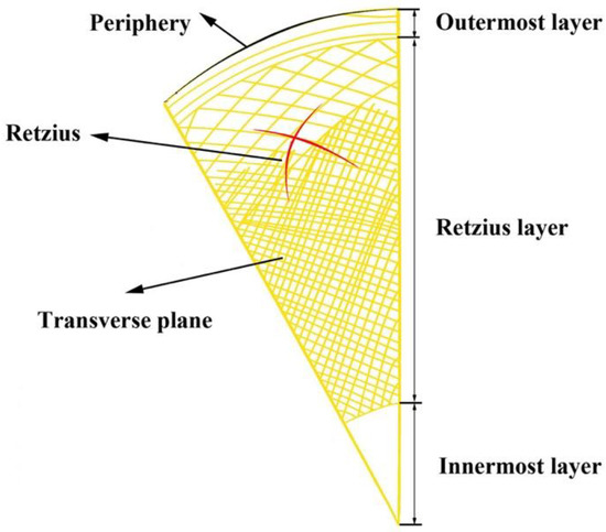 Schematic diagram of Retzius. This pattern consists of alternative light and dark lines interweaving to form a network, which begin at the center of the tusk and sweep outwards to the periphery.