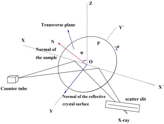 For the X-ray pole figures, the specimens were cleaned and then sectioned into a round sheet with transverse surfaces up, 3 cm in diameter and 2 mm in thickness using a microtome (Figure 5). The transverse surfaces were polished and studied in a D/MAX 3A X-ray diffractometer (Rigaku, Tokyo, Japan) at 30 kV and 25 mA using Co radiation and equipped with an area detector. Figure 6 shows the schematic diagram of the testing method. Samples were placed with the transverse planes normal to the vertical axis and tilted about a horizontal axis XXˊ from tilt angle φ = 0° to φ = 88° in 10° steps, as well as rotated about their normal N from azimuth angle α = 0° to α = 360° in 3° steps with a 20 s time of exposition. A divergent slit width of 1.2° and a scatter slit width of 5° were employed for the beam source, and a receiving slit width of 3 mm was used for the detector.