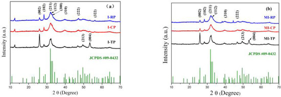 X-ray diffraction patterns of ivory and mammoth ivory with three different testing planes are presented in Figure 7a,b, respectively. These patterns show that the d values of the characteristic peaks at approximately 25.9° (d = 3.439Å), 31.8° (d = 2.815 Å) and 32.2° (d = 2.779Å) present no significant difference from the standard pattern of hydroxyapatite (Ca10(PO4)6OH2), according to JCPDS 09-0432, indicating that the predominant inorganic phase of these samples is hydroxyapatite. The number of diffraction peaks of the specimens is less than the number of diffraction peaks of standard hydroxyapatite. Moreover, it is noted that the peaks assigned to (211), (112) and (300) moved to a higher angle area at 31–33°, while the peaks assigned to (002) and (102) moved to a lower angle area at 25–28°.