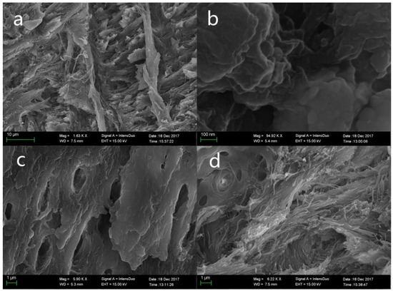 The SEM images along radial planes show the lamellar structure (Figure 8a and Figure 9a) and the hydroxyapatite appeared as tabular ranged regularly and tightly (Figure 8b and Figure 9b). As shown in Figure 8c,d and Figure 9c,d, circumferential planes were permeated by tubules that run from the central pulp to the periphery of the outermost layer and the collagen fibril arranged along perpendicular to the long axes of the tubules.