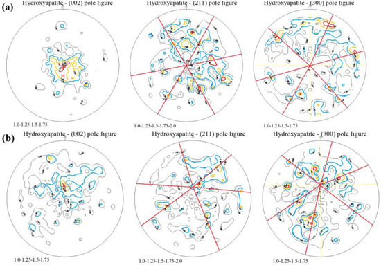 X-ray pole figures of hydroxyapatite: (a) (002), (300) and (211) pole figures of hydroxyapatite in ivory, (b) the same in mammoth ivory.
