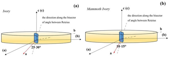 Many researchers have made great efforts to explore the two materials and have focused on the structure and the relationship between hydroxyapatite and a matrix of collagen fibrils [5,11,12]. For ivory and mammoth ivory, the orientation of hydroxyapatite crystals is strictly controlled by the organic matter during bio-mineralization, which leads to some of their excellent properties, such as high toughness. The details of the exquisite architectures and the formation mechanisms for ivory and mammoth ivory are still not clearly known, particularly regarding the sizes, shapes and organizational states of hydroxyapatite. Significant progress has been made on hard tissues of several species using electron microscopy. The size of hydroxyapatite crystal has generally been accepted to be 35–70 nm in length, with a width of approximately 25–50 nm and a minimum uniform thickness of 2–5 nm [7,13,14,15,16,17,18,19,20]. Such crystal sizes present a conceptual problem related to the ultrastructure accommodation at the molecular level in collagen. The crystals are inferred to be located within the collagen fibrils or between the fibrils [18,19]. However, these studies all provided evidence of a morphological orientation. The actual crystallographic orientation, which is also called the fabric, remained conjectural.