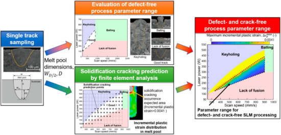 Outline of the proposed framework for determining appropriate selective laser melting (SLM) process parameter range considering defects and crack occurrence.