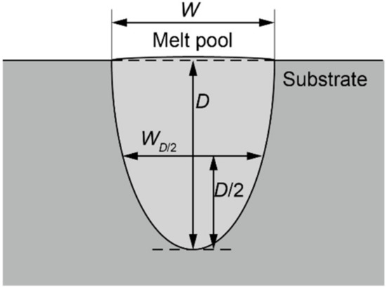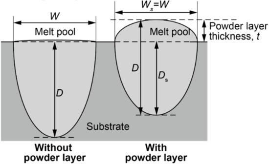 by geometrical considerations [11], where is the powder layer thickness. Equation (2) is based on the assumption that the results of single-track tests, including the powder layer, are used, and the results of single-track tests without powder in this study cannot be used without modification. This is because the melt pool depth of the single-track parts with the powder layer is obtained by subtracting the thickness of the powder layer from the thickness of the total melt area, and the melt pool depth of the single-track parts without the powder layer is the length of the total molten area in the thickness direction. As shown in Figure 3, we first assumed the melt pool width of the single-track parts without powder and the melt pool width of the single-track parts with the powder layer were equal. Then, we also assumed the melt pool depth of the single-track parts without the powder layer was the sum of the melt pool depth of the single-track parts with the powder layer and the powder layer thickness. In other words, we assumed that,