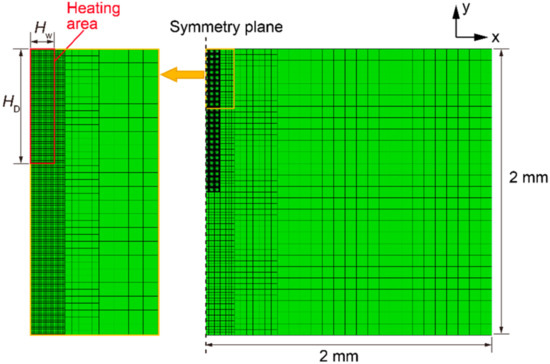In a previous study, the authors investigated the correlation between the strain behavior in the high-temperature region, which can be obtained via a thermal elastoplastic analysis, and the occurrence of solidification cracking in the actual parts of single-track melt components within the process parameter range assuming the SLM process [16]. As a result, it was clarified that solidification cracking occurs when the maximum value of the incremental plastic strain in the solid–liquid coexistence temperature range during the cooling process , obtained through the thermal elastoplastic analysis, exceeds a threshold value. This threshold value is useful for predicting the occurrence of solidification cracks caused by the fracture of the residual liquid film. In the thermal elastoplastic analysis, the occurrence of solidification cracking in single-track parts with a powder layer can be predicted without considering the effect of the powder layer. In the present study, solidification crack occurrence was predicted using the same method. The thermal elastoplastic finite element analysis was performed by conducting a one-way coupled analysis, in which a transient heat conduction analysis was carried out without considering the deformation, and then, an elastoplastic analysis was performed with reference to the temperature history of each node. The same mesh was used for the heat conduction finite element analysis and the elastoplastic finite element analysis. A fine element division (5 μm square) was performed near the region where melting was expected.