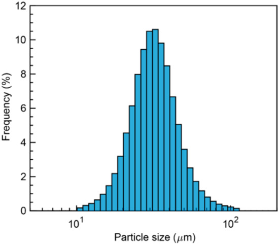 Hastelloy X powder (AMPERPRINT 0228; Höganäs AB, Höganäs) prepared by gas atomization was used to fabricate the parts. Table 2 lists the composition of the Hastelloy-X powder used. Figure 5 and Figure 6 shows the SEM image of Hastelloy-X powder and particle size distribution of the powder, evaluated using a particle size analyzer with laser diffraction scattering. The SLM system and substrate were the same as those described in Section 2.1.1. The laser power and scan speed were determined by referring to the results of the search for the process parameter range that does not cause defects or cracks, obtained using the procedure described in Section 2.1 and 2.2.