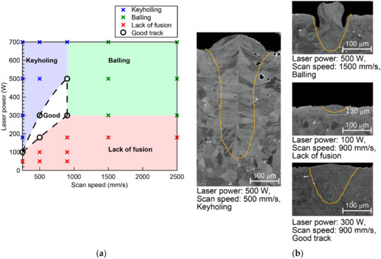 To this end, Seede et al. proposed a framework to determine the appropriate process parameters that do not cause keyholing, balling, or residual unmelted areas by combining single-track tests and analytical model evaluations [11]. The single-track test is a method used to obtain a melt pool on a line by scanning a laser only on a single line under various fabrication conditions; this test can be performed in a shorter duration compared with fabricating parts of several tens of square millimeters. Keyholing is a phenomenon in which the porosity remains at the bottom of the melt pool when the melt pool has an extremely large depth relative to its width [12,13]. Keyholing occurs under high laser power and low scan speed conditions. Balling is a phenomenon in which the melt pool solidifies into a spherical shape owing to the unstable flow of the melt pool [14,15], and a notch-like groove is formed at the outer edge of the melt pool. Balling occurs under high laser power and high scan speed conditions. A residual unmelted area is observed when the powder layer cannot be completely melted. This is due to the low laser power, high scan speed, and large hatch spacing.